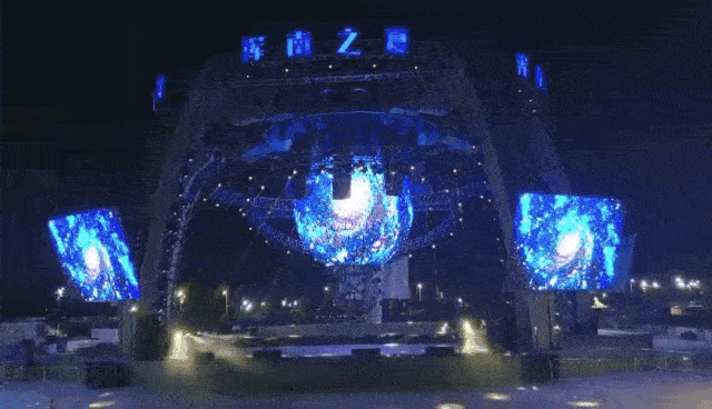 中央懸掛的高清多維球形屏幕,由512塊單體屏幕包裹而成,采用的是金立翔戶外P5間距LED屏,配合頂部的機械手裝置造型,為演出呈現精彩絕倫的立體特效,帶領觀眾穿梭時空,打造出既熱烈又炫酷的現場氛圍。